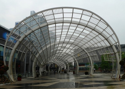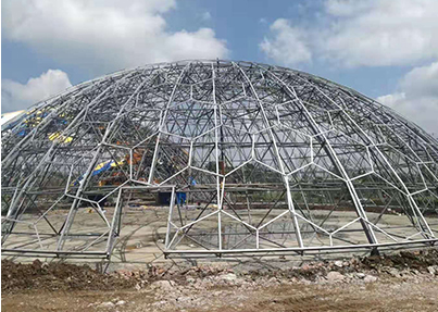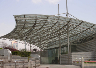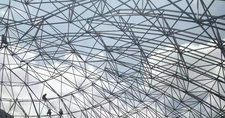 由多根杆件按照一定的网格形式通过节点连结而成的空间结构。具有空间受力小、重量轻、刚度大、抗震性能好等优点;可用作体育馆、 影剧院、展览厅、候车厅、体育场看台雨篷、飞机库、双向大柱距车间等建筑的屋盖。